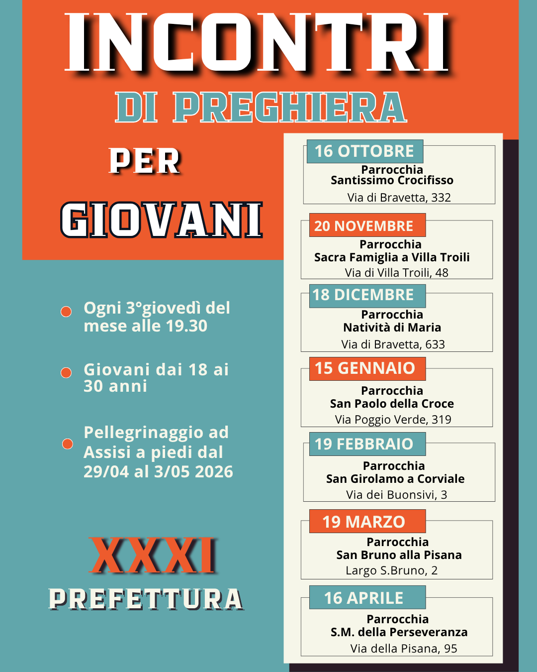 La XXXI prefettura sta collaborando per organizzare una serie di incontri dedicati alla preghiera insieme ai giovani e per i giovani, che si terranno presso ciascuna delle sette parrocchie appartenenti alla nostra prefettura. La locandina fornisce informazioni dettagliate su date e sedi degli incontri. Ogni appuntamento prevede l’Adorazione Eucaristica guidata dal sacerdote e animata dai ragazzi, una catechesi incentrata su un vizio capitale e un momento di conviviale.