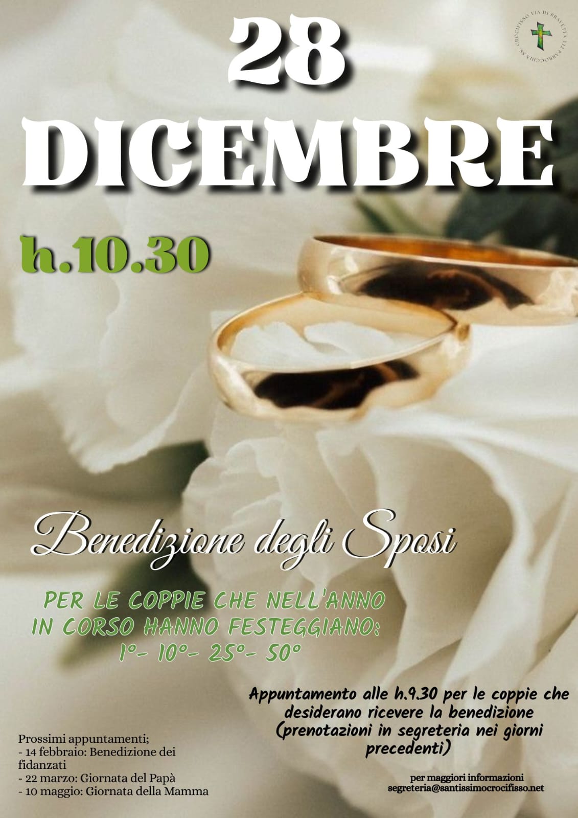 In occasione della Domenica della Sacra Famiglia, prevista per il 28 dicembre, verranno dedicate preghiere alle famiglie della parrocchia durante le celebrazioni delle Sante Messe. In particolare, durante la Santa Messa delle ore 10.30 si svolgerà un evento speciale dedicato alle coppie che nel 2025 hanno celebrato 1, 5, 10, 25, 50 o 60 anni di matrimonio; a tali coppie sarà conferita una benedizione speciale. L’intera comunità parrocchiale sarà invitata a condividere questo momento significativo e a trarre ispirazione dalla testimonianza di amore e fedeltà di queste coppie all’alleanza nuziale.